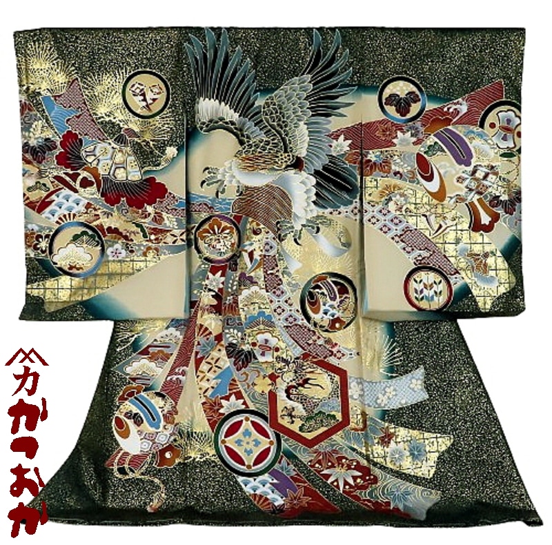 お宮参り着物正絹(初着・産着)男児G3-59 鷹に打ち出の小槌・熨斗目に龍の柄(金叩き)緑地 5大特典付