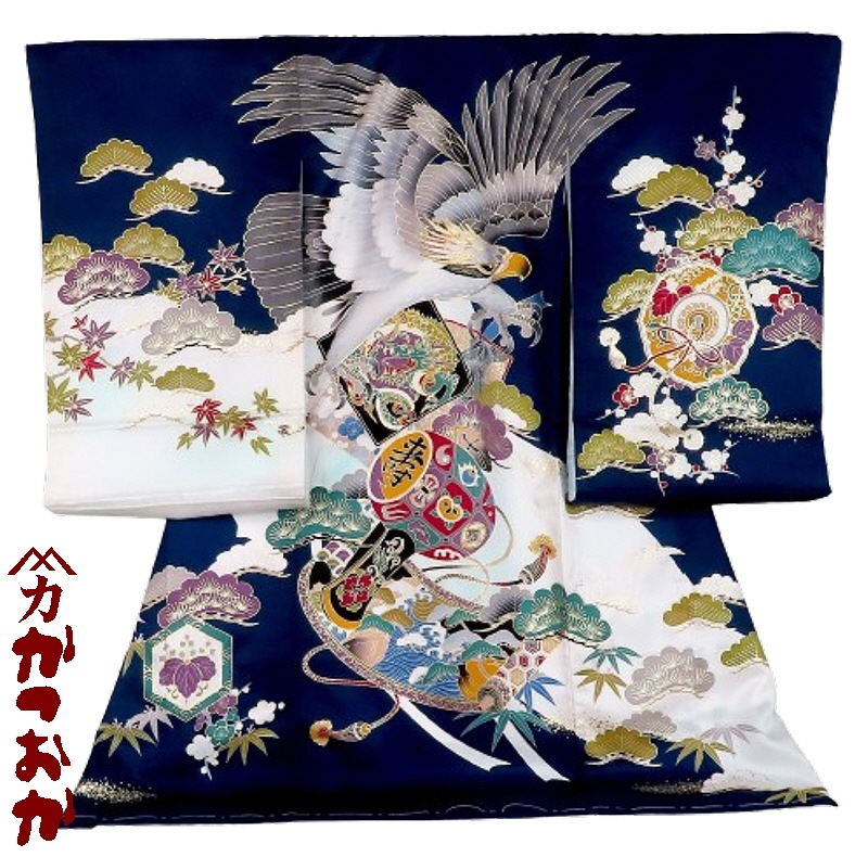 お宮参り着物正絹(初着・産着)男児G3-52 鷹に龍・打ち出の小槌の柄 紺地 5大特典付